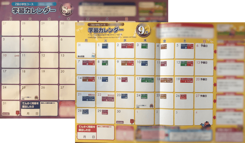 [st-kaiwa1]小5・6年ではZ会の本科5教科(国算理社のハイレベル&英)と専科の「作文」「適性検査」を受講していましたが、土日も含めて毎日1〜2教科(60〜80分ほど)学習して、ちょうど1ヶ月でやりきる感じでした。1ヶ月の学習計画は、教材と一緒に送られてくる学習計画カレンダーを活用しています。計画通りにできない時は、余裕のある日に変更するなど調整することも。高学年からはこういった学習スケジュールの管理も子ども自身にやらせると良いですね。[/st-kaiwa1]