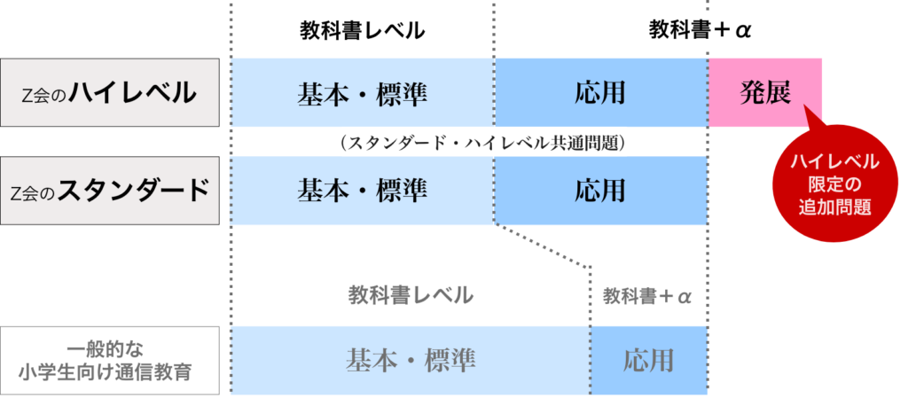 Z会小学生コースの公式ウェブサイトでは、教材の難易度を下の図(Z会公式ウェブサイトを参考に作成)のように表しています。