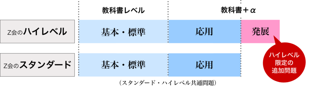 こちらを見ると分かりやすいですが、スタンダートとハイレベルの違いは「発展問題」があるか・ないか。「基本・標準問題」と「応用問題」はスタンダード・ハイレベル共通の同じ内容で、ハイレベルのみ発展問題(1回分)が追加されるんです。